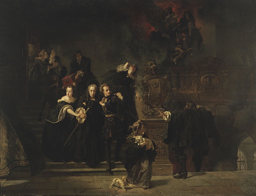 Oljemålningen ”Slottsbranden” av Johan Fredrik Höckert (1826–1866) visar tragiken när riksklenoden Tre Kronor går upp i rök.